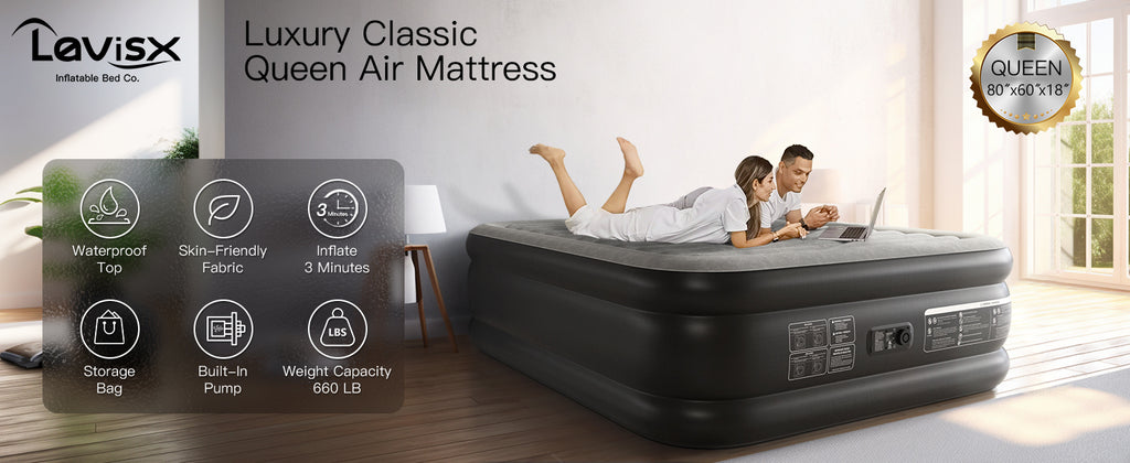 Drift into deep relaxation with our premium Lavisx Queen Air Mattress with Built-In Pump, designed to deliver cloud-like comfort for a truly refreshing night’s sleep. Whether at home or outdoors, this inflatable bed provides the perfect balance of softness, support, and convenience.