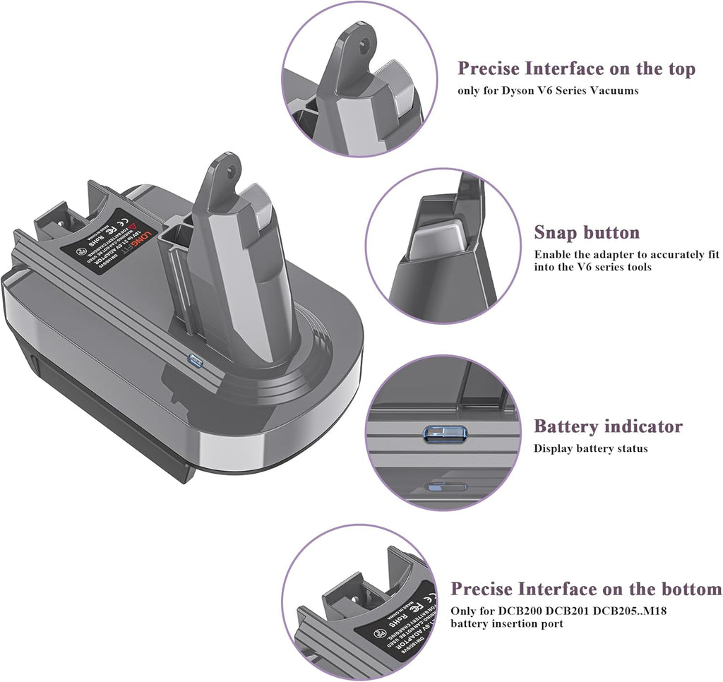 - The V6 battery adapter buit-in over voltage, over charge, over current and over heat protection technology, safe to use. Designed with led indicator. We provide 100% satisfaction warranty for this dewalt 18V/20V or M-18 18V battery to Dyson V6 adapter, any problem will be solved.
