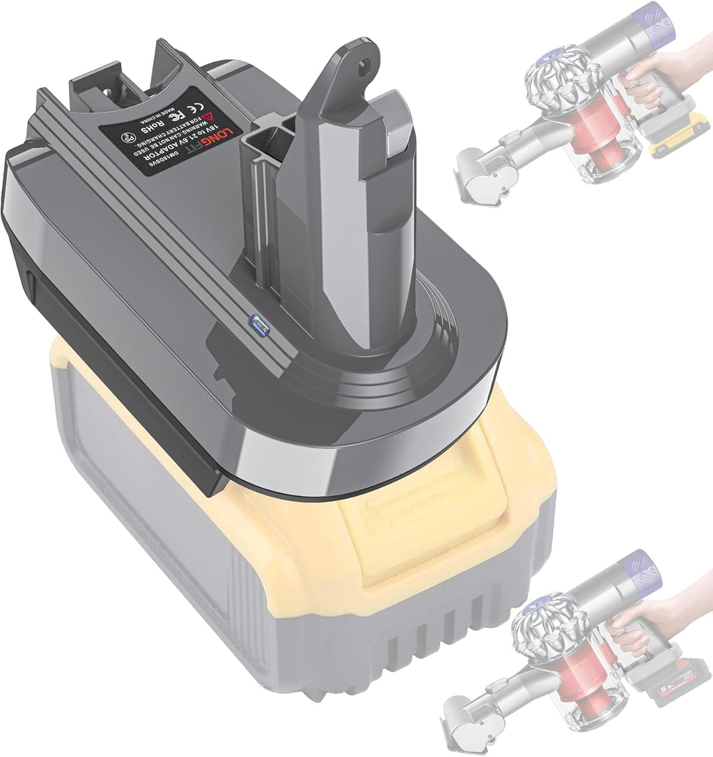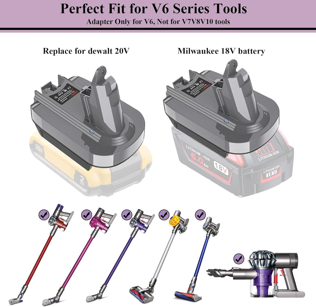 - Replace for Dyson V6 adapted, Converting the dewalt battery or M-18 battery to Dyson V6 batteries only three steps: 1. Remove the original battery from the V6 series vacuum cleaner; 2. Install our V6 adapter into the base of vacuum cleaner; 3. Insert dewalt 18V/ 20V or Milwaukee 18V battery into the base of our adapter, and then you can use the dyson V6 vacuum cleaner as normal. NOTE: Please remove the battery when not in use.
