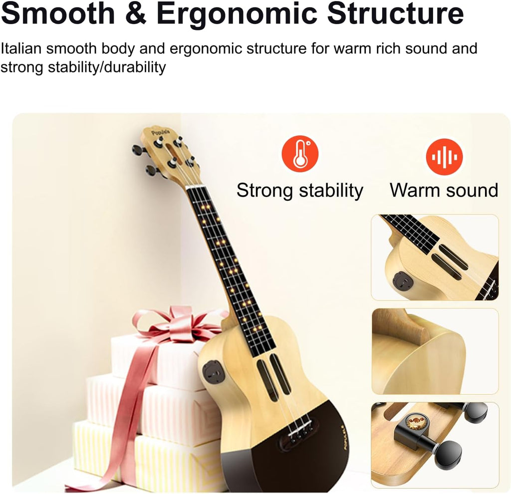 - Guiding LED Lights: The ukulele for beginners with 72 LEDs shows finger placement and syncs with your smart device for easy learning and practice.It utilizes powerful algorithms and advanced dual-pickup technology to precisely detect the dynamics of your practice, helping you with fundamental skill exercises.