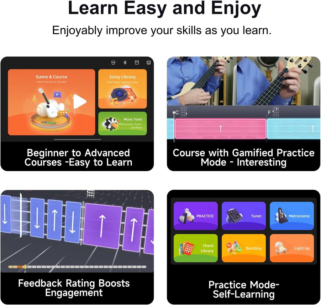 - Smart Ukulele: The intelligent visual interactive exercise guidance makes it easier for beginners to learn how to play because it offers real-time instruction and feedback.