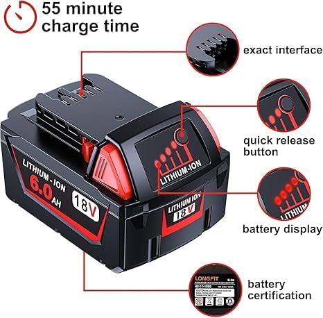 - 【Replacement for Milwaukee M18 Battery】 Battery Type: Lithium-ion | Condition: Brand new | Capacity: 6000mAh | Voltage: 18V | The replacement battery for m18 milwaukee battery greatly improve your work efficiency!
